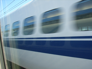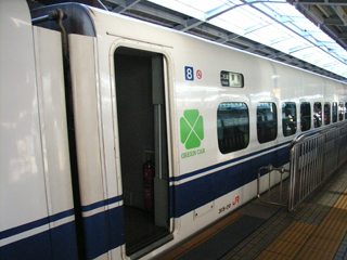 車内に戻ると隣のシートに既に着席者がいました。駅長はD席ですけどA、B、C席を購入した3人の家族連れのようです。他にも駅長たちの周りに乗客が固まっています。多分グリーン車の客は全員ぷらっとこだまのツアー客で はないでしょうか。正規の料金で乗車するのであれば、のぞみに使用される700系や500系のシートの方がいい出来ですから。出発です。9号車はモーターの付いている車両なので、インバーターがくぃーんくぃーんとうなる音を聞きながらです。この音、300系の登場当初はかなり音が大きく不快になる原因だったと記憶していますが、いつの間にかそんな声は聞かなくなりました。音が改善されたのか、他の電車もみんなインバータ駆動になって耳が音に慣れたのか、は判りません。