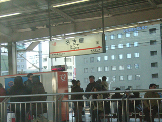 さて米原でのぞみ退避で6分停車です。空いているならカメラを持ってホームをうろうろ、でもいいんですけど、今日は 駅長の周りだけ混んでいるのでシートでノンびりします。 進行方向右側、海側のシートなのでのぞみが本線を通過する時にがつんと衝撃が伝わります。