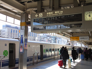 また、米原と岐阜羽島の両駅が、駅の規模に比してホーム数が多いのは、関ヶ原の着雪を落とすために多数の編成を収納出来るように設計されているそうです。こびりついた雪が氷になって線路に落ちると跳ね返って床下機器を壊したりするそうですから困ったもんです。沿線には急に住宅が目立ち始めました。もう都内への通勤圏です。SL-C860でのんびりと日誌を入力してたら新横浜到着です。下りホームには帰省客が列車を待つ長い列ができています。