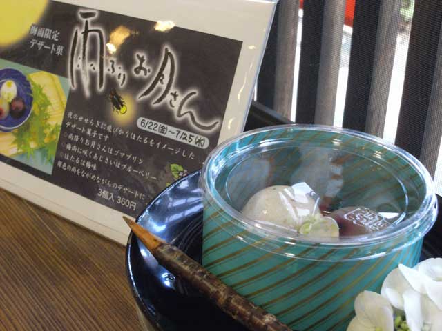 最後のは均一な色ではないだんご。蛍をイメージした梅風味だ。梅というところでかねなし氏は引いちゃったようだけどこれが梅のいい風味だけが見事に残っていておいしい。続いて涼花だ。こっちはヤーコンを練り込んだぷるぷるのお菓子。蜜をかけて食べる。この蜜が何とも深い味でかけたところとかけてないところの味が大きく変わって楽しい。