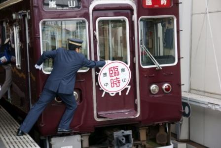 ホームには同業者が数人。乗車するために来たとおぼしき姿も目につく。やって来たのは当然7017F。臨時|嵐山の幕を出している。ヘッドマークなしなのは蛍池を通過してから幕を回したのだろう。予想通り車内からヘッドマークが出て来て貫通路に装着された。