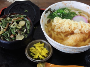 まずは昼食。みんな飽きたと思われるが駅長はちっとも飽きないえび天うどんと山菜ごはん(逝)