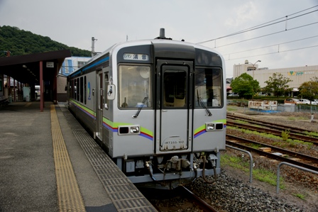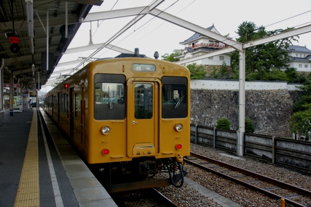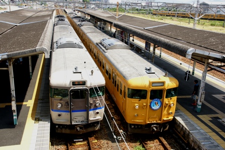 というわけで一駅糸崎まで。乗ってきた444MがJR西日本標準色(俗にカフェオレ色)、355Mが残念な新塗色である黄色1色なので並びを1枚。単塗色化はコスト低減のためらしいが手抜きの印象が強くならないか。また中途半端以上に似合ってしまうところが残念でもある。