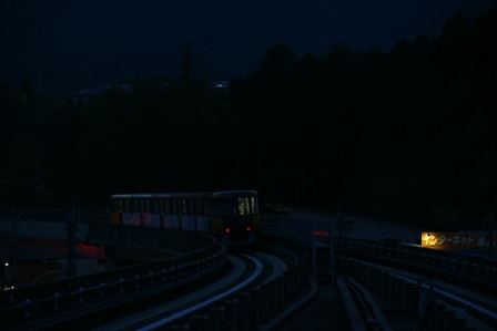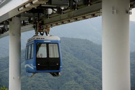 ホームにはもう電車(?)がいる。ロープウェイっぽい外観だけど車内はクーラーが効いていて気持ちいい。また、車輛は頭上のロープではなくレールを掴んでいる。