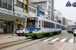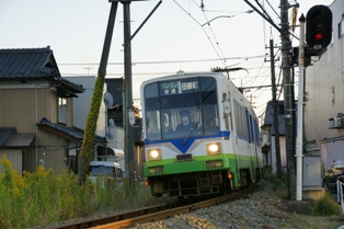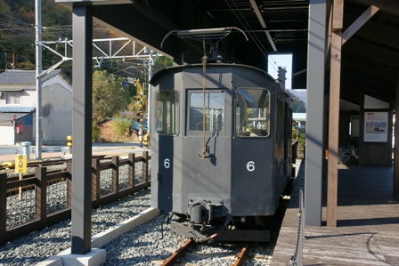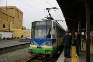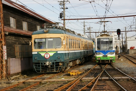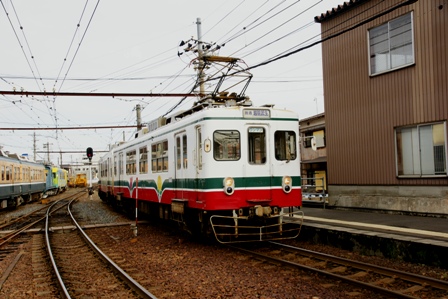 やって来た坂本行はまんが日本昔ばなしのラッピングだった。むむ。車内から車庫を観察したらパト電車が奥にいた。残念。