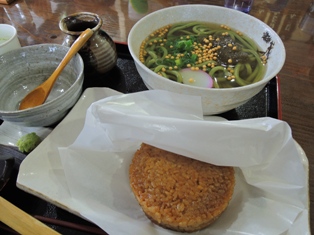 駅長の定番の山菜ごはんが売り切れていたがまあいい。近江バーガーと茶うどんセットにする。1000円。よく考えたら定番のえび天うどんと山菜ごはんの組み合わせより高いのな(逝)