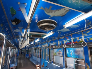 ちょうど入れ替わりに到着の電車がやって来て、これがはしる水族館電車だった。車内もラッピングされていて涼しげだ。
