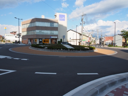 と言うやり取りがあったのは、ラウンドアバウト。地名で言うと東和町交差点だ。いわゆるロータリーで信号を完全に取り去った交差点だ。ロータリー内は時計回りでロータリー内を走るクルマに優先権がある。