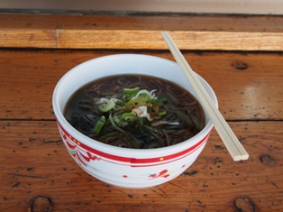 さすがに平日。空いてるなあ。10分とかからず到着できた。まずはそばだ。