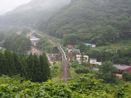 白川口を出て、信号場で交換のための停車。へえ。こんなところに信号場が、と思ったら、ここ、道の駅美濃白川の真裏じゃん。ここ信号場だったのか。全然知らなかったよ。鷲原信号場というらしい。