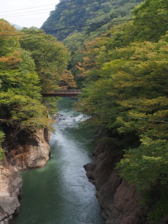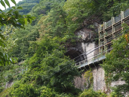 吾妻渓谷沿いの国道はクルマも多いけど歩道がちゃんとあって歩き易い。はるか下方を流れる水音も癒しである。