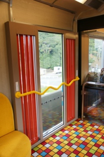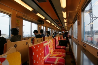 さて、車内は3号車が座席スペース。。窓向きにカラフルなセパレートシートが並ぶ。ドアは4ドアのうち1カ所だけが残されて後は座席になっている。もともとあった窓は開閉可能。ドア位置部分に新設された窓は固定窓、網棚もそこには設置されない、となかなかの割切りになっている。