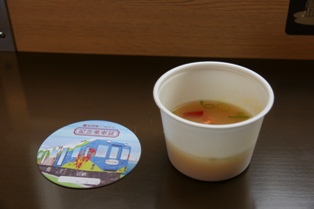 鳥羽の手前で、アナウンスが入り、2号車のイベントスペースで志摩市の観光協会から伊勢エビ汁のふるまいがあるとのことでいただきに行く。コースターを兼ねた乗車記念証もいただけた。もちろんコースターとしてなど使わないけど(逝)