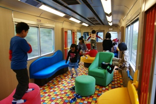 1号車は座席スペースのほか、風の遊び場と称した、フリースペースになっている。ドアの開口部をスリットにして風を感じられる構造でいわゆる天空方式だね。