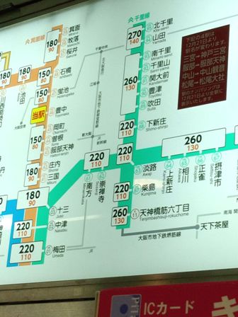 豊中到着後ポスターを見たら、確かに服部天神下車とあった。当然だね。で、改札を出て、運賃表を見て仰天。