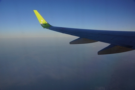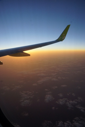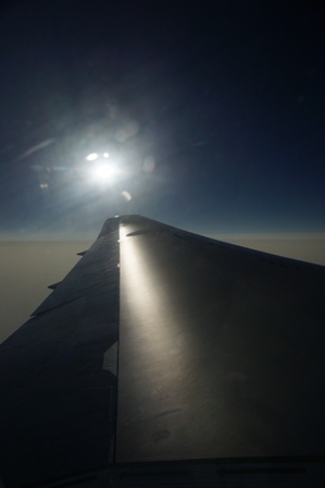 あっと言う間に地上の建物が小さくなって行く。離陸後5分くらいすると電子機器の使用が許可されたので、取り敢えず空を撮る。幸い北上する航路の左側の席。夕日が撮れるんじゃないか、と思うけど、1800を過ぎても全然光が赤くならないよ。