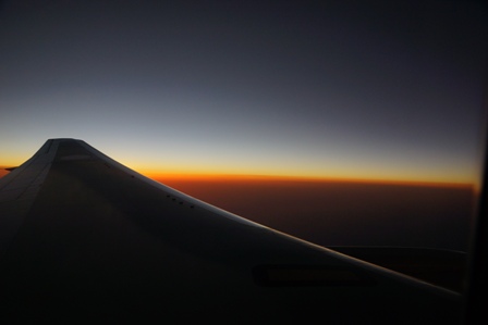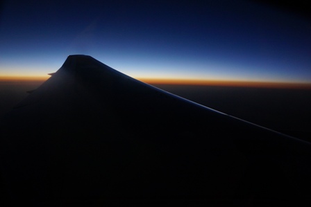 1825を過ぎると急に窓の外が光を失い始めた。残念ながら沈む日は主翼の後ろで肝心なところが見えない。