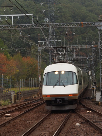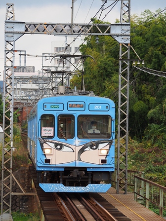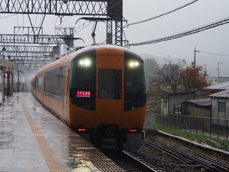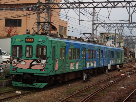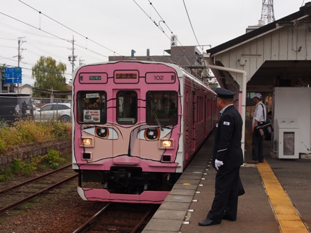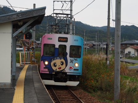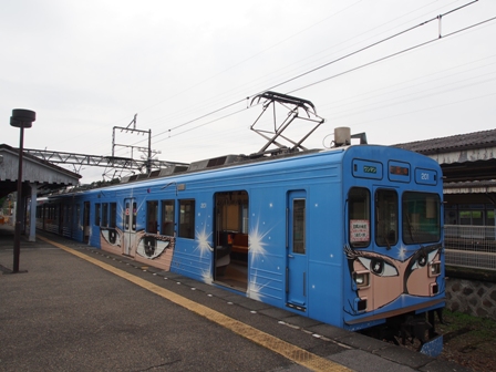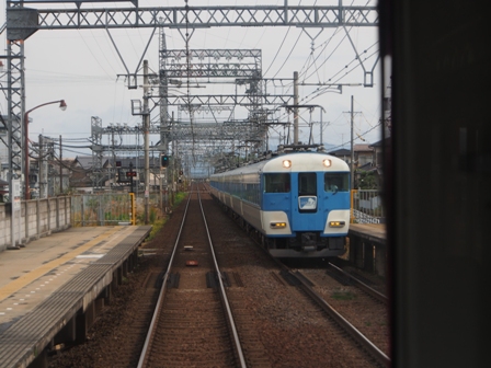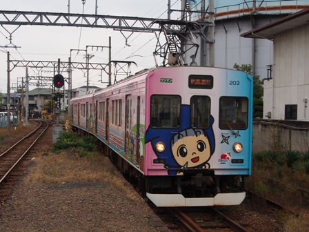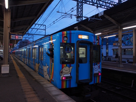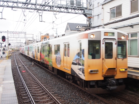 やって来た上り急行がラッピング編成だったのでカメラを向けたら思い切り被写体ぶれ(逝)