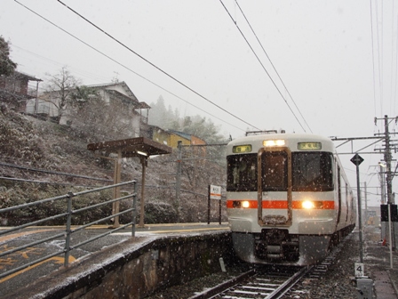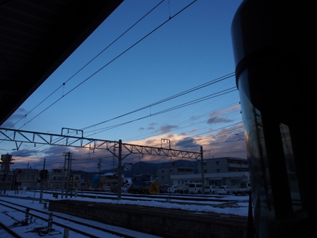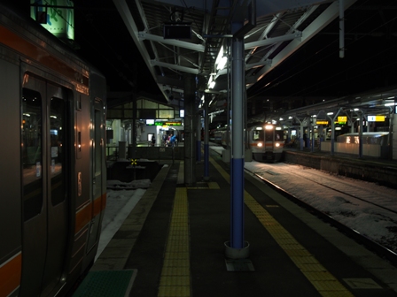 長野県に入ると雪が強く降り出した。ホームに落ちた雪が溶けるのに時間がかかってるぞ。これで延々降ると、積もる訳だが。