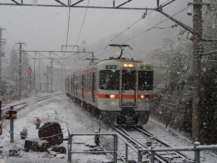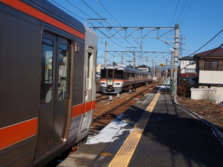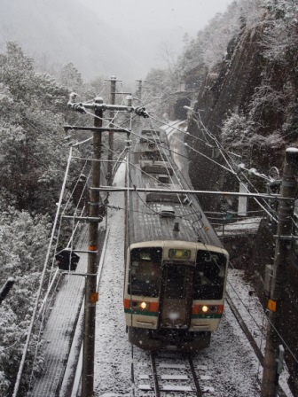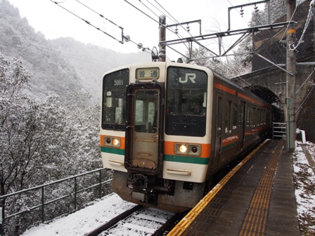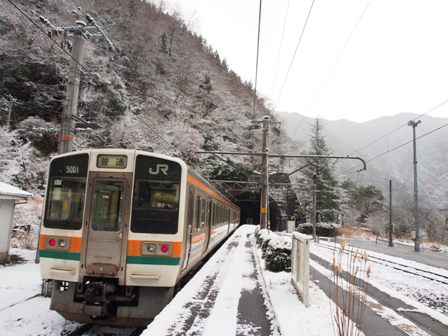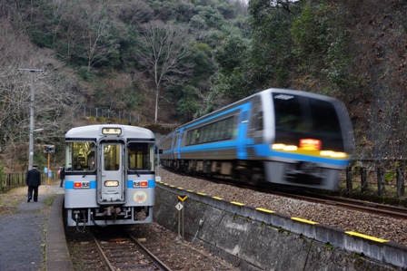 高遠原の手前にある大沢信号場で上り電車を退避。213系が通過していった。