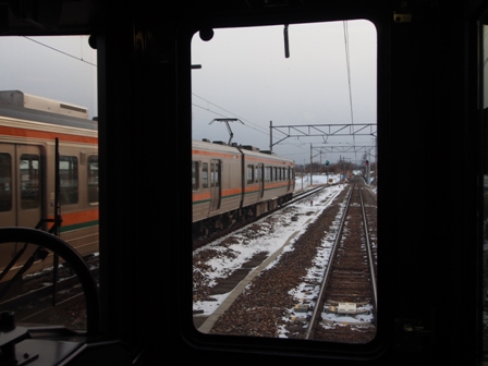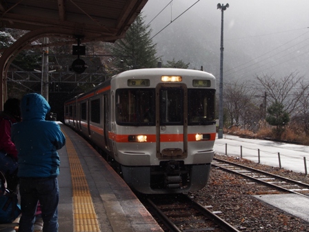 発車時刻だが出発しないところで車掌氏より案内。遅延の原因は時又〜伊那八幡間の架線凍結であり、これにより上り列車に大きな遅れが出ているとのこと。