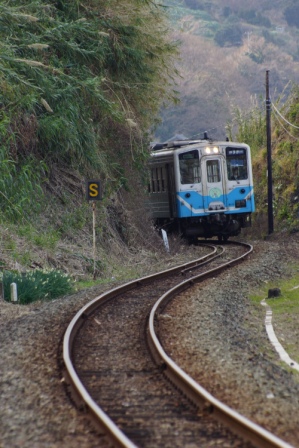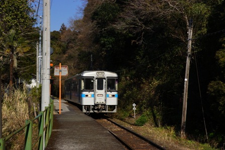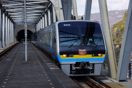 分岐すると海へ向けてゆっくりと下って行く。伊予上灘で上り列車と交換。