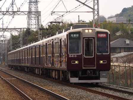 河原町で折り返してきた快速特急を迎撃するも、正面過ぎてラッピングが見えない(逝)