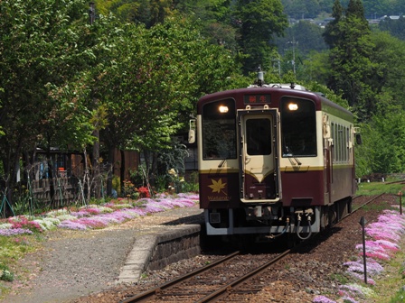 移動して上り列車を駅と花をからめて桐生方の踏切から撮影する。