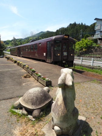 この駅は、童謡うさぎとかめの作者石原和三郎の生誕地ということで、ホームにはうさぎとかめの石像がある。割と最近作られたらしい。