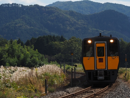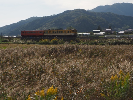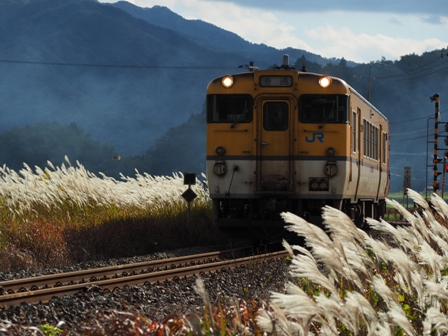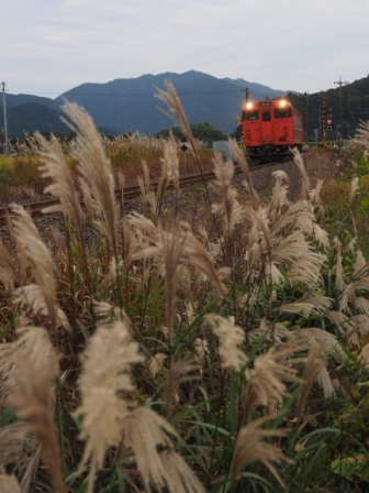 下り普通を逆光を逆手にとってすすきと絡めてみる。