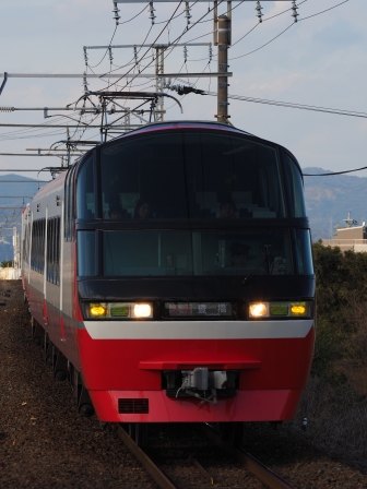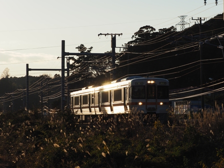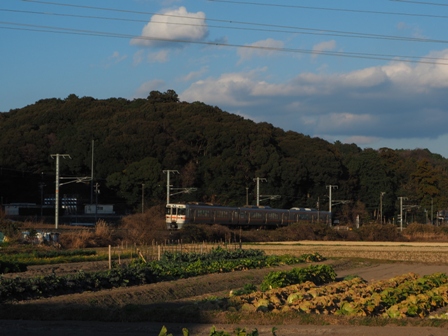いい感じで日が傾いてきた。逆光で下り電車を捉える。面白い感じになった。