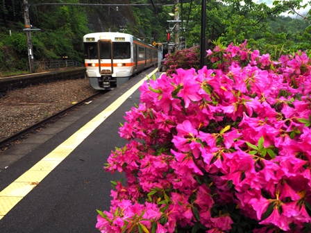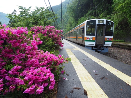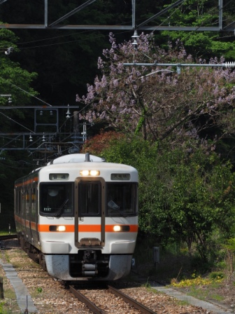 上り普通はここで下り列車と交換。見事な藤の花とからめて到着する下り列車を撮影した。