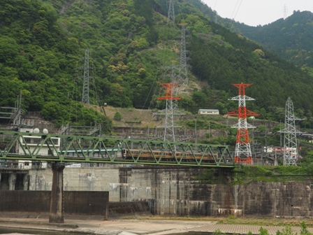 三脚をもってぽくぽく歩いて天竜川橋梁の東側へ向かう。こっち側が順光なんだよね。鉄橋と発電所を絡めて撮ってみよう。
