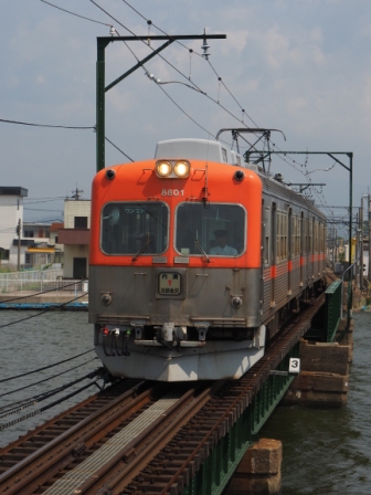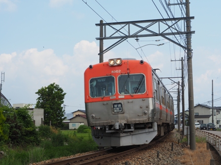 浅野川線の車両は元京王3000系。前頭部の上半分はオレンジ色だ。