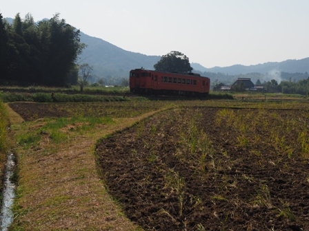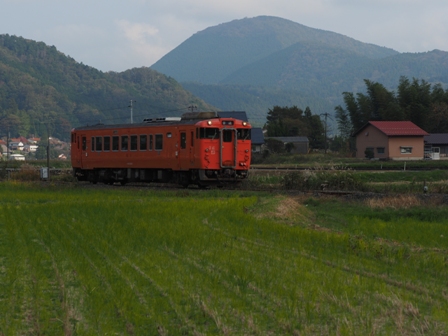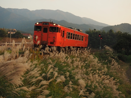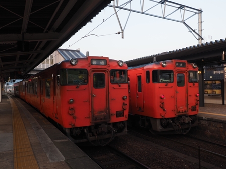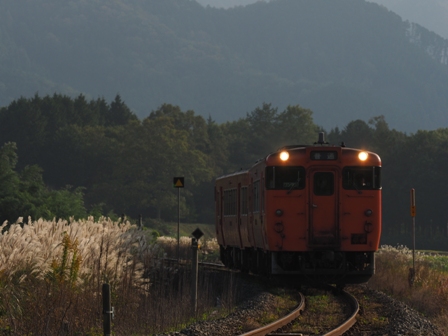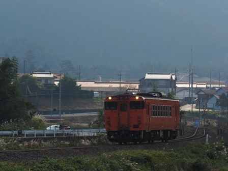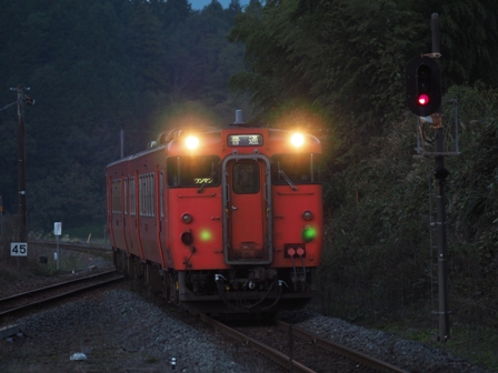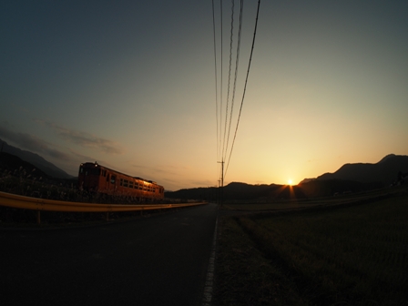 赤く空が染まり出したころ、単行のキハ40がヘッドライトを輝かせて通過して行った。