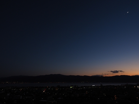 部屋から諏訪湖と夕暮れと月と金星を撮る。いいね。