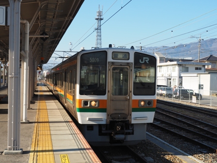 辰野で8分停車、JR東日本に入り乗務員氏が交替する。1620下諏訪着。
