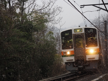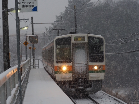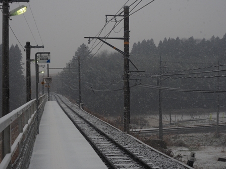 上り電車は三脚を立てた場所がアウトだったようで警笛を鳴らされてしまった。む。雪がちらつき出した。