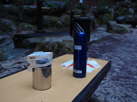 そしてコーヒー。猿庫の泉で沸かしたお湯でインスタントドリップのコーヒーをいれる。