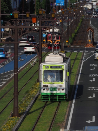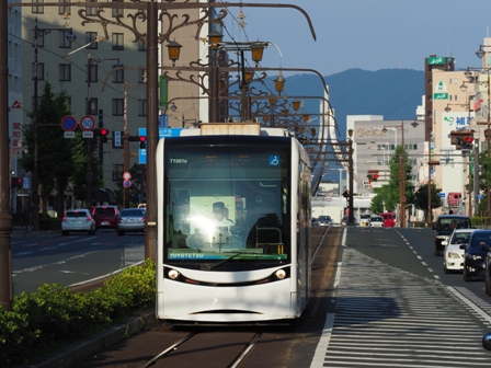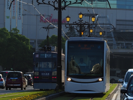 駅前大通の停留所スペースから撮ってみる。駅前へ向かう電車が順光。駅前から出てくる電車がド逆光だがこれはこれで味がある。