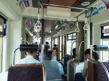 広くて窓の大きい車内は快適だ。クロスシートなのも楽しい。まあ、この系列が増備されると行き場を失うのは3200形だからこれでいいのかもしれない。