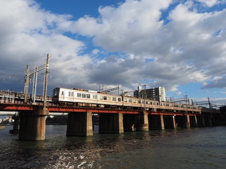 古い橋脚が残っているが、これ、官製鉄道、つまり国鉄東海道本線が最初に使用した非常に古い橋脚なのだ。国鉄の方はその後ルート変更を行ったが、残された橋脚を使って後に阪急と合併する新京阪鉄道が千里線を建設した、というとても興味深い歴史的構造物なのだ。