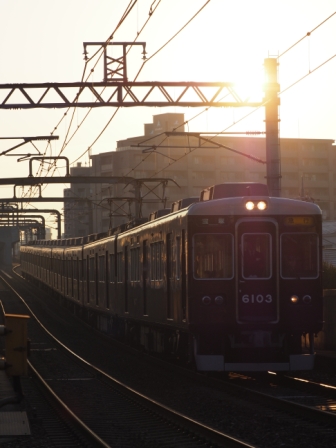 40-150mmを装着して日の出をバックに高架を下ってくる下り電車を撮影する。おおむねイメージどおり。