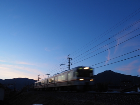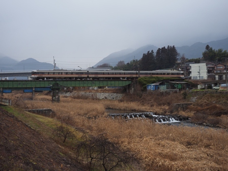 次に、移動して高台からの風景をバックに下り列車を撮る、がド逆光で失敗。曇りの日だとどうだろう。