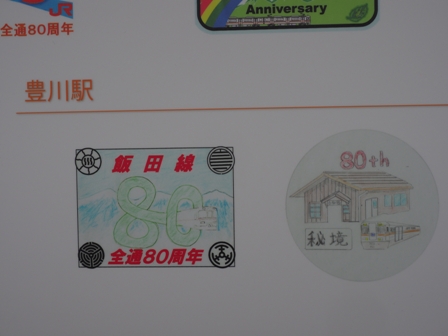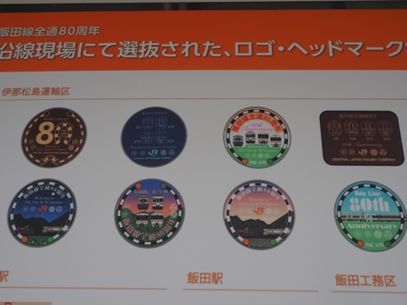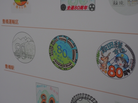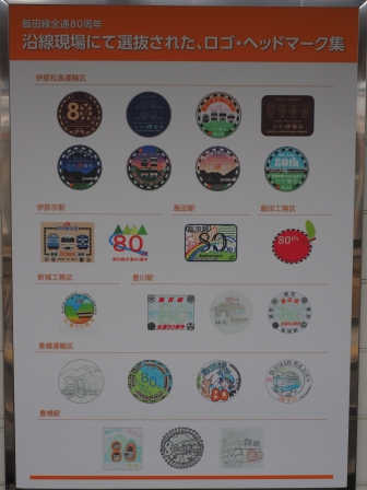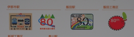 今年、飯田線は全通80周年を迎え各所でイベントがあったのだけど、現場でもイベントがあったようで各部署で「飯田線80周年記念のヘッドマークやロゴ」を制作するコンテストみたいなモノがあったらしい。らしい、というのが1番線ホームにあったこれ。