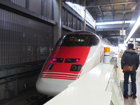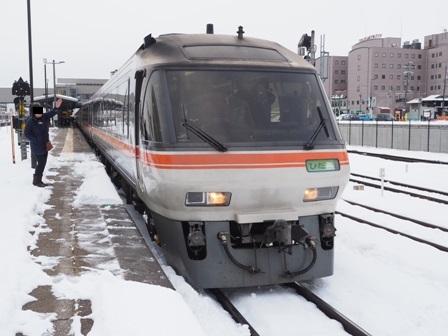 サンダーバード1号だ。昨日までは雪の影響で運休しまくっていたので運転されるか気が気ではなかったのだけどちゃんと走ってくれる。まあ、帰りは心配だけど。お、ちょうど入線してきたところだ。朝食など調達済みだったらこのタイミングで十分という事か。