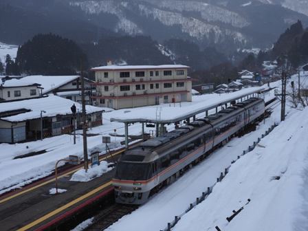 狭い道だけど融雪のための散水も行われていて整備されてるな。もっとも道路が水浸しだともいえる。駅を見下ろす箇所で下りワイドビューひだを撮影。