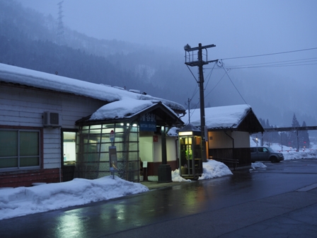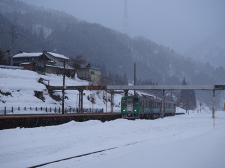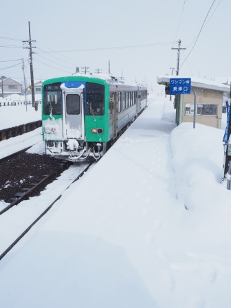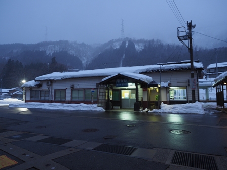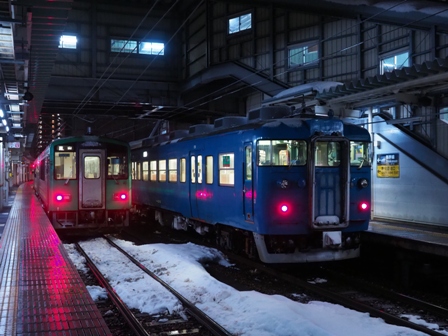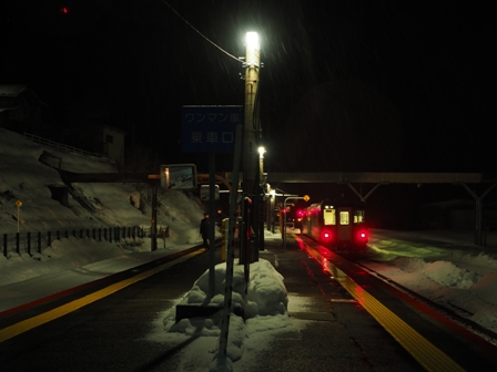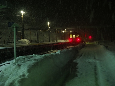 日没後に到着する列車を撮影する。あっと言う間に雪でずぶ濡れだけど、駅舎が暖かいのが本当ありがたい。