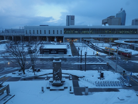 雪がぱらついてる。耐雪装備は車内でいいや、と思ったけど路面が溶けかけのシャーベット状で危うく駅までの100mで靴が浸水するところだった。