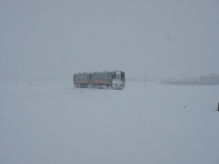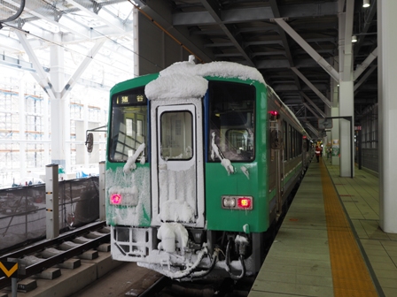 車掌氏から大雪の影響での車両変更とアナウンスがあった。0630出発。